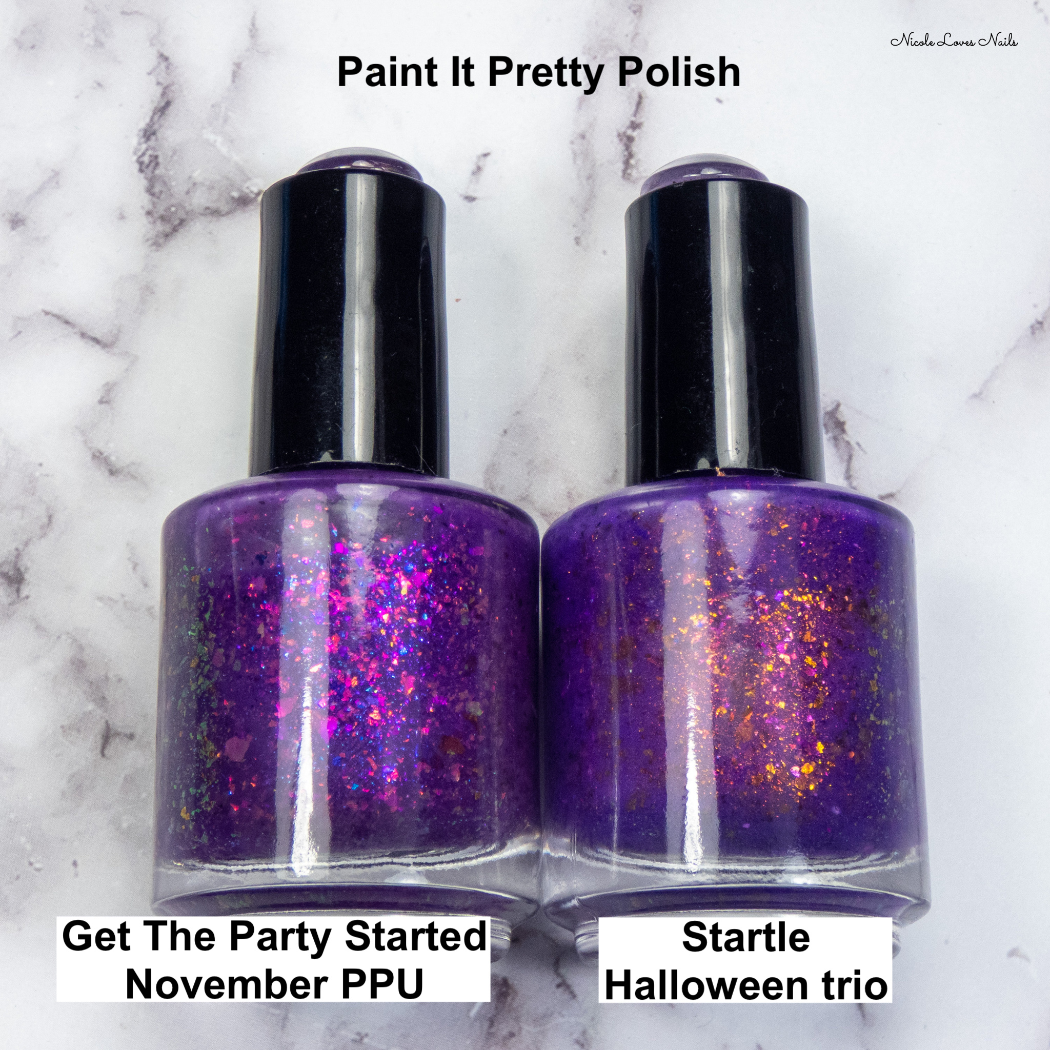 Just wanted to add, the shade of purple of this polish is different from the Paint It Pretty Polish Startle from the Halloween trio (reviewed here). The thermal aspects are different and the flakies are different colors as well!