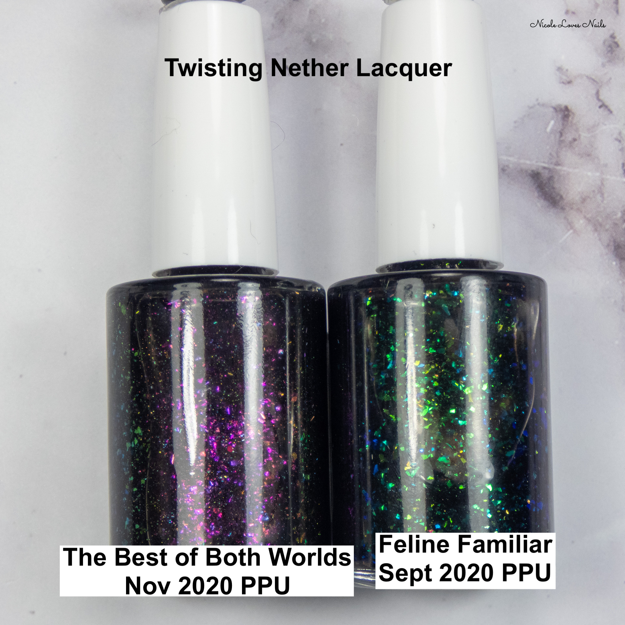 I’m also going to throw this comparison in of the Twisting Nether Lacquer Feline Familiar. This was their September 2020 PPU polish. These both of have black bases with flakies. The Best Of Both Worlds however has more color shifting flakies as well as holographic flakes in it. I have swatches of Feline Familiar on this blog post.