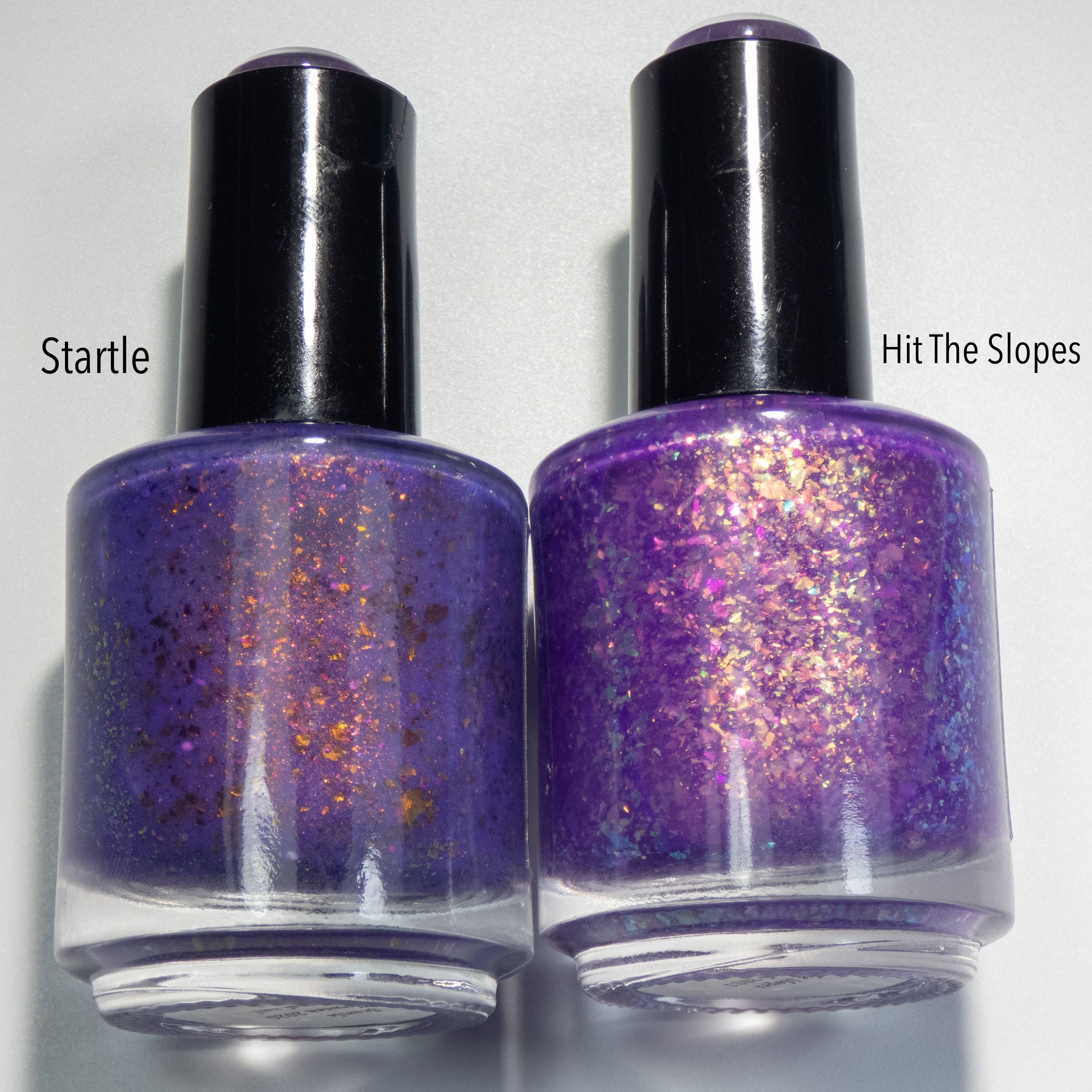 Startle (from the Halloween Thermal Trio reviewed here) in the warm state is more of a dusty denim blue. Hit The Slopes is a clear sky blue aka the kind of blue I wish the sky was right now. Startle also has a cooler feel to it. The flakies are totally different in these polishes. Not dupes! Startle is still available on the Paint It Pretty Polish Etsy page.