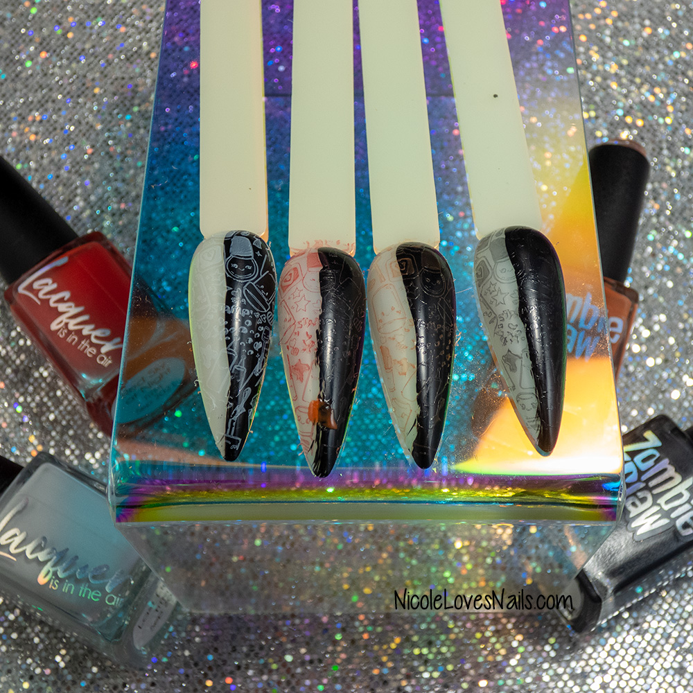 While these aren’t marketed as stamping polishes, I decided to give them a go at stamping anyway. The only one that I would really say would work for stamping is the light gray polish. T